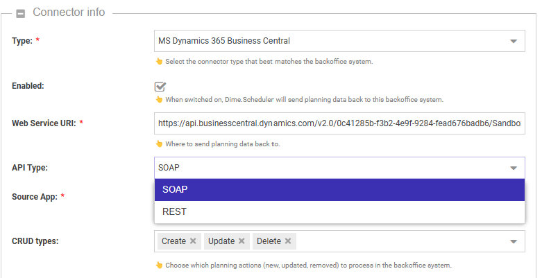 To establish a connection with a back-office system, you need to create a record in the connector setup in Dime.Scheduler and provide the right configuration that Dime.Scheduler can use to successfully write back to the system of your choice.