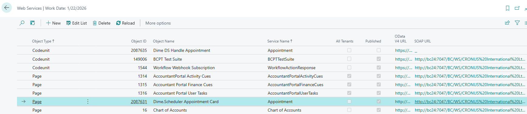 Navigate to the 'Web Services' page in Business Central, locate the Dime.Scheduler Appointment Card page, and copy the SOAP URL value. The value will look like something like this: