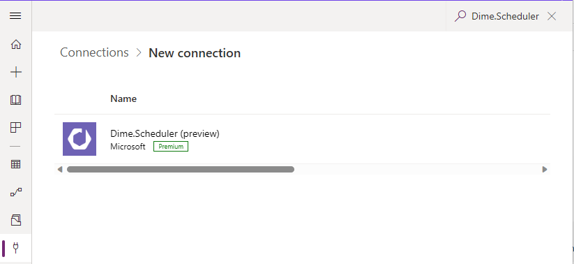Navigate to the Power Platform's Connections list and click the 'New connection' button. Scroll down and look for 'Dime.Scheduler'. Or simply search for 'Dime.Scheduler' in the search box: