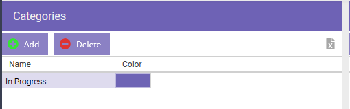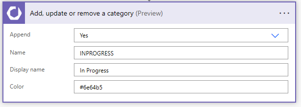 A category is a pretty simple type. All you need to fill out is a name and a color, and indicate whether to append (create or update) or to remove the record. The name is used as the external identifier while the display name will be shown throughout the application. When you're done, you should have something like this: