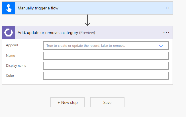 This will show the Flow builder with the trigger already added to the canvas. We are going to add one step to give meaning to this flow. Click the + New step button and look for Dime.Scheduler in the search box. In the actions list, look for the 'Add, update or remove a category' action and select it.