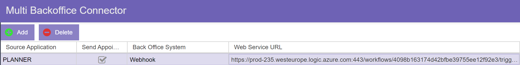 In the connector setup page, ensure that there is a record that has the same value and contains a valid URI that points to the back-office system. In our scenario, we want to invoke the Power Automate flow we just created. Create a new record and specify the same source application as the jobs and tasks you just created, tick the checkbox, select 'Webhook' as the back-office system, and paste the URL of the Power Automate flow trigger: