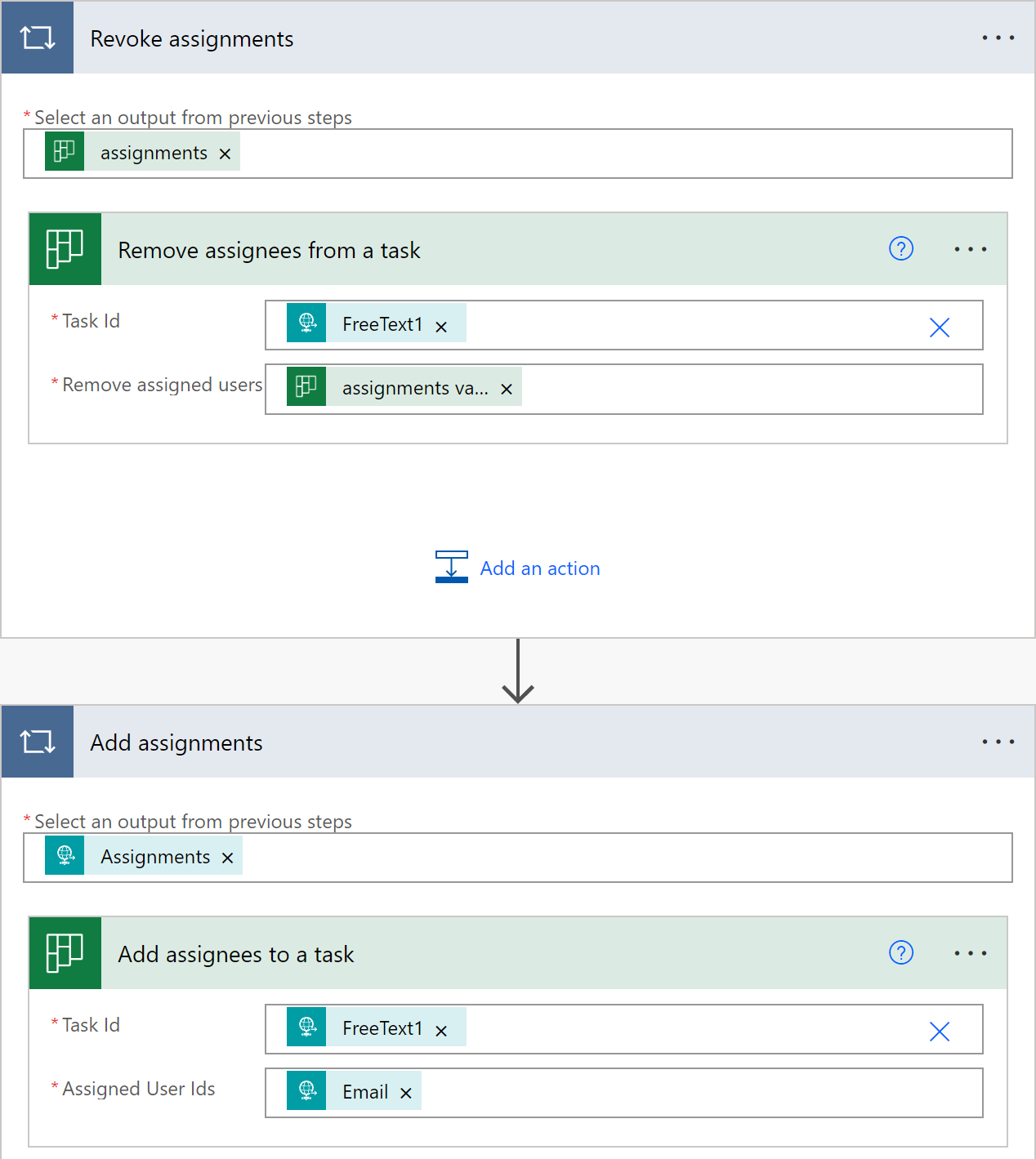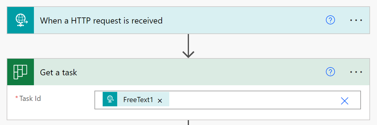 In order to update the Planner task, we must first retrieve it. To do so, add the 'Get a task' action, select the targeted list and use the FreeText1 variable in the to-do task field. You'll recall that we've stored the Planner task's identifier in this free text field, which we now use to fetch the original item in the plan.