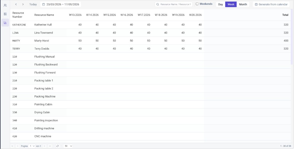 Resource capacity entries are maintained in the application on the Resource capacity screen. You can view and edit values in the grid: each row is a resource and the columns are time buckets (day, week, or month, depending on the view). Use the date range, search, and view options to work across the horizon you need.