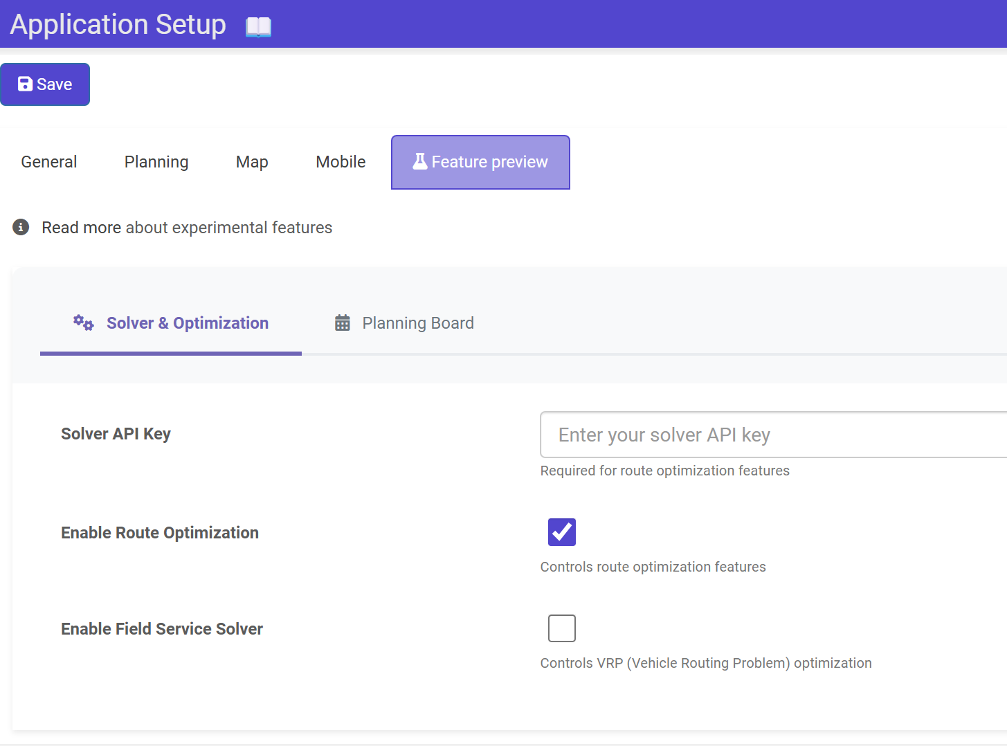 The VRP feature must be enabled in the preview features settings before use, and a solver API key must be provided to use the service.