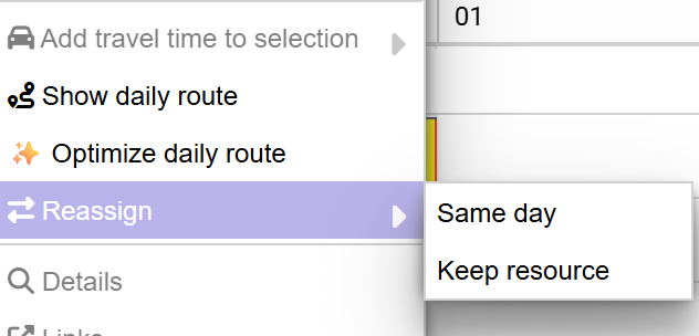 The VRP solver can now be invoked directly from the planning board, allowing you to automatically reassign the planning of a resource for a day. When using the solver from the planning board, you have two reassignment options: