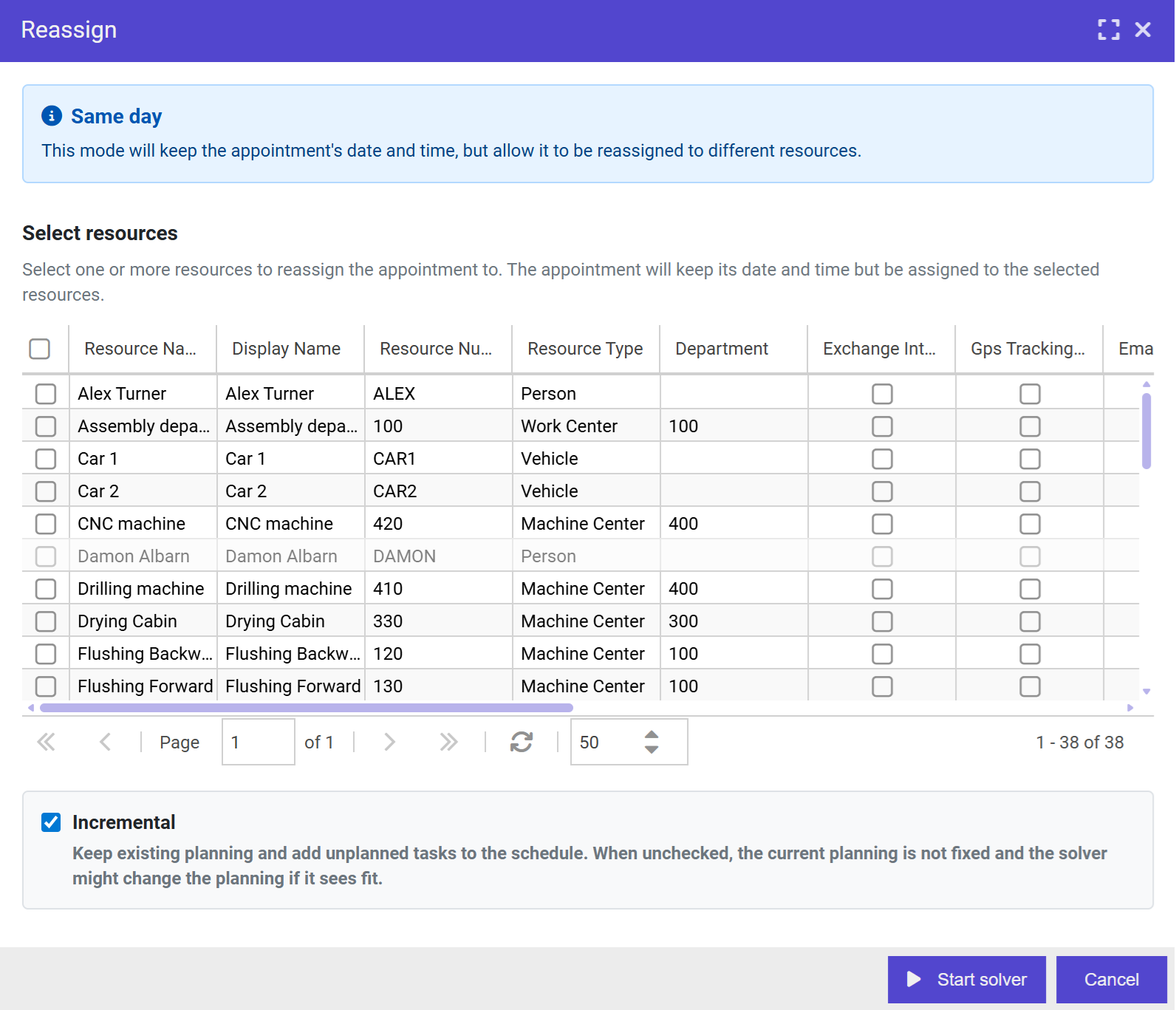 - Keep resource: The solver will keep the resource assigned but may change the date/time of appointments