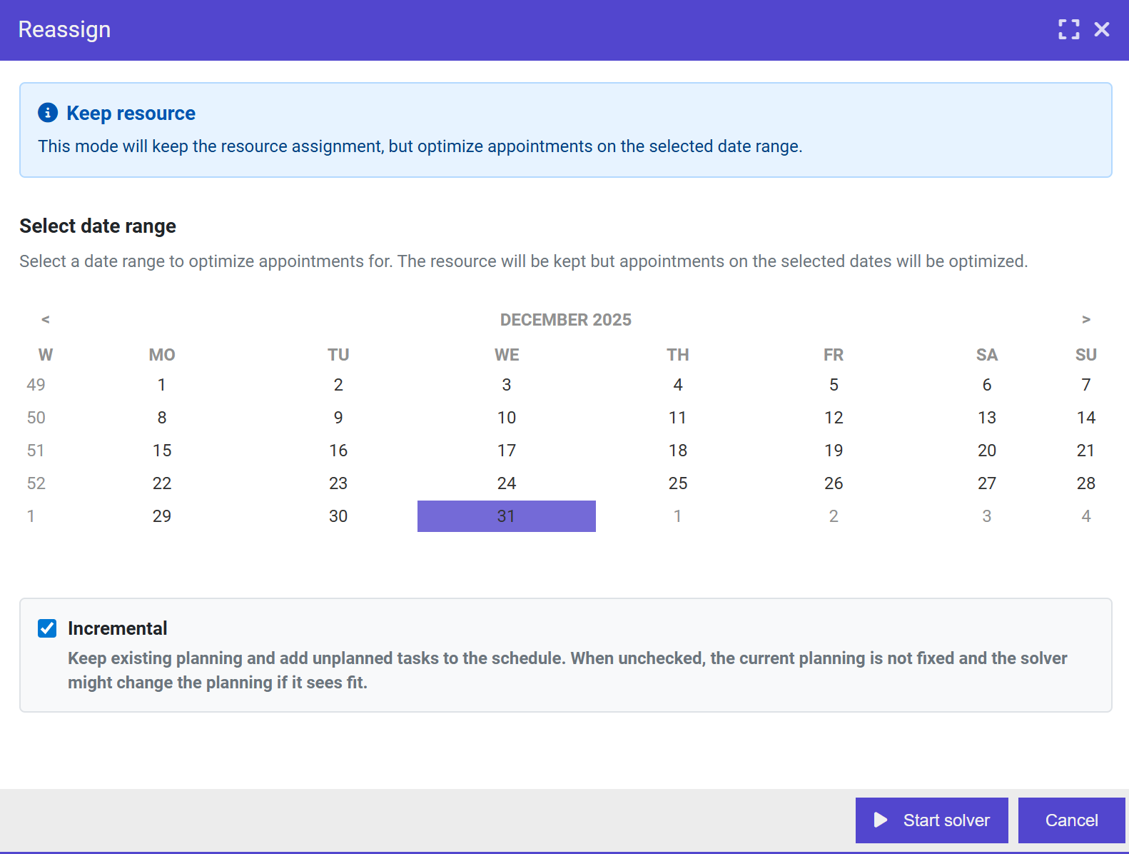- Keep date: The solver will keep the date/time but may reassign appointments to different resources
