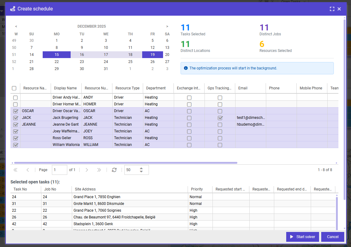 Select a date range that the solver must plan in, as well as the resources that must be incorporated. To run the solver, click the "Start solver" button, which will run a task in the background to create the schedule.